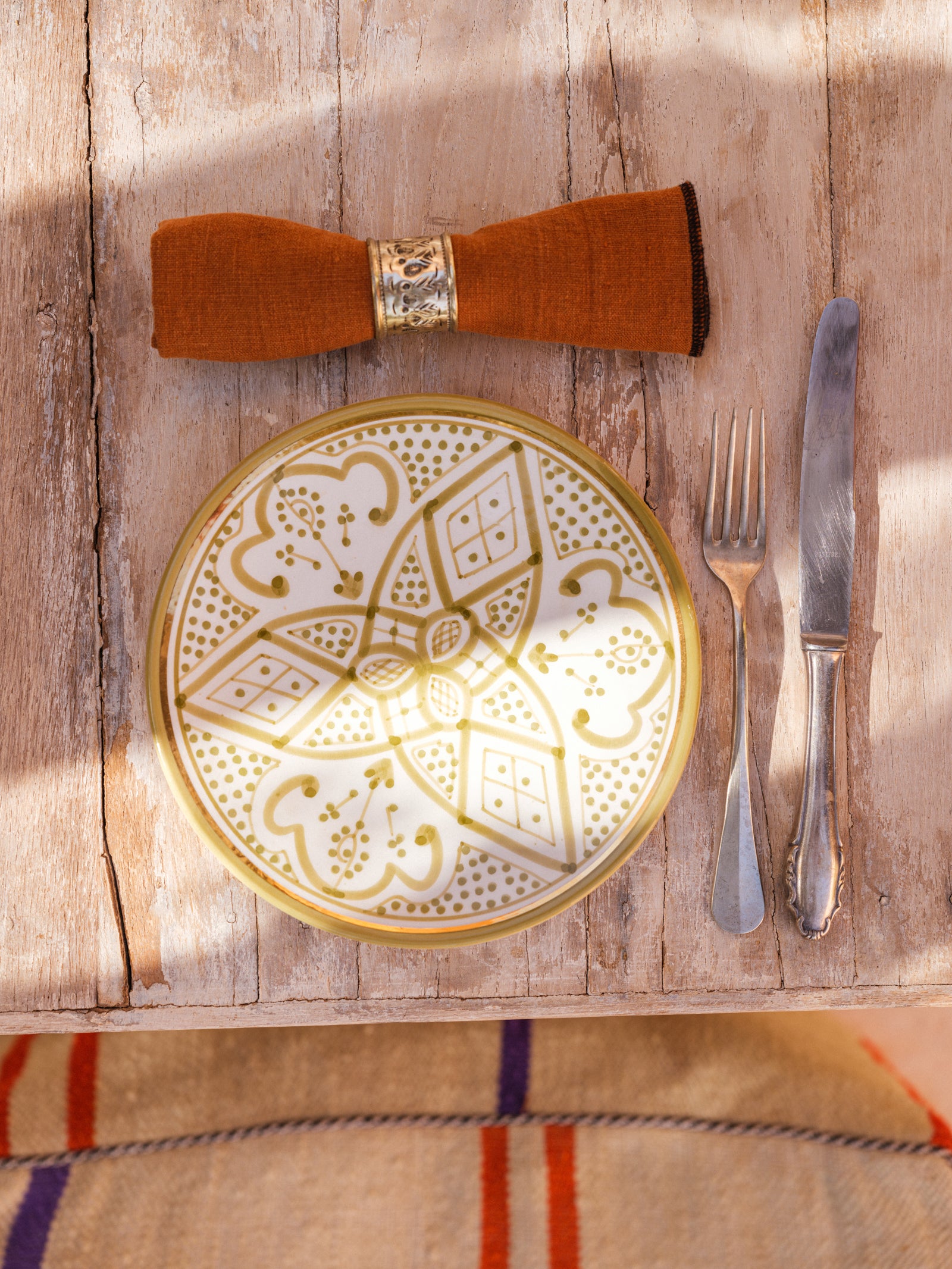 • Fabrication artisanale : Chaque pièce est soigneusement réalisée à la main à travers une dizaine d'étapes essentielles, incluant le moulage, le peinturage des motifs, l'émaillage et trois cuissons, dont la dernière révèle l'éclat de l'or véritable. Ce long processus peut prendre jusqu'à 10 jours. Ce dévouement au détail assure une qualité exceptionnelle tout en mettant en valeur le savoir-faire traditionnel marocain.