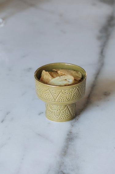 Découvrez nos Bols Aperitivo Empreinte kaki gold, de petites coupes élégantes conçues pour mettre en scène vos aliments. Ces objets au design raffiné incarnent parfaitement le style Chabi-Chic, alliant esthétique et fonctionnalité pour apporter une touche d'élégance à vos moments de partage. Que ce soit sur une table lors d’un apéritif ou au tea time pour présenter chocolats et gâteaux, ces bols sauront sublimer vos délices culinaires.