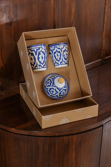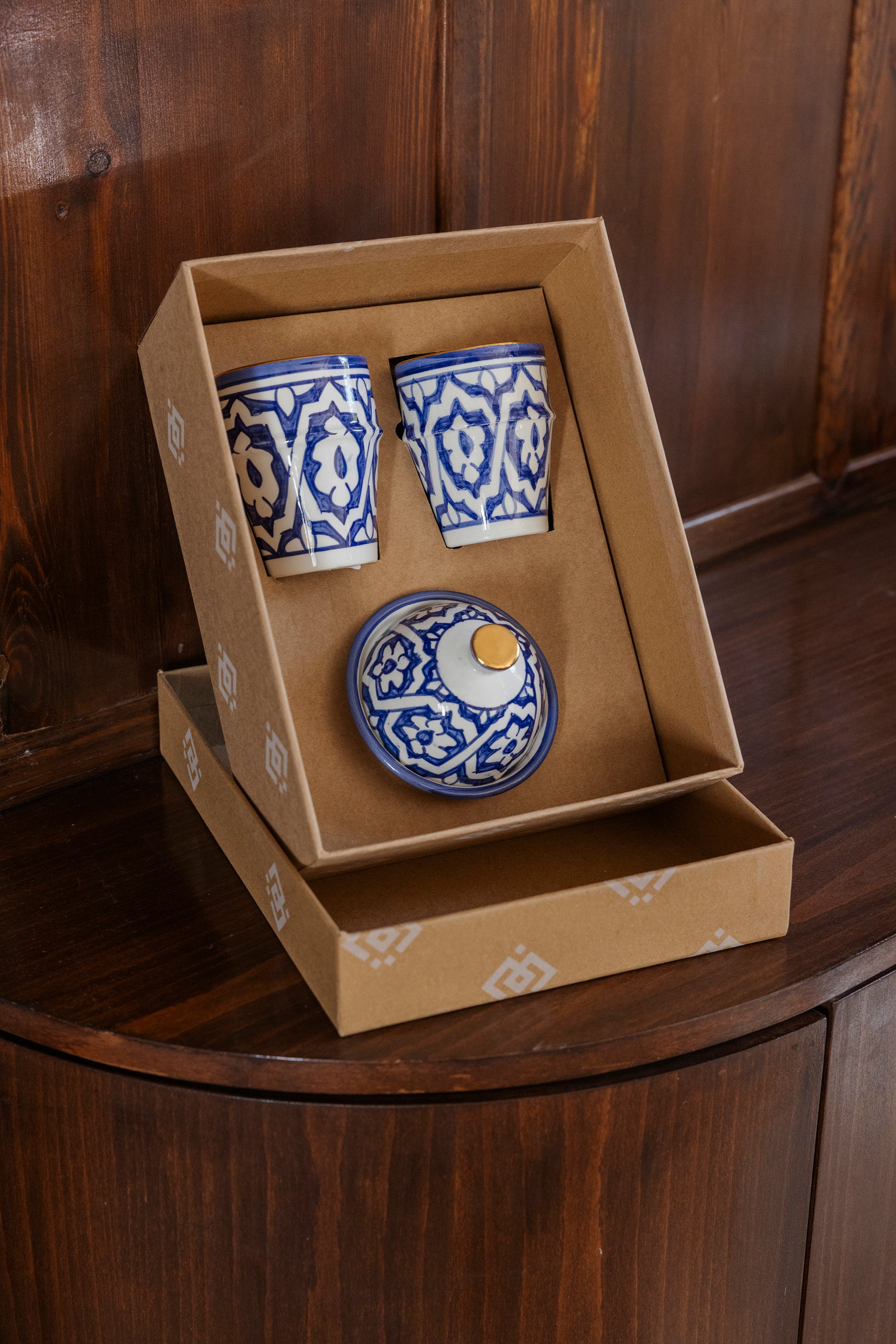Offrez un cadeau unique et chaleureux avec ce coffret 2 Moyennes tasses et un beurrier fassia bleu majorelle gold, idéal pour faire plaisir à vos proches. Chaque création représente un moment d’artisanat, façonnée à la main pendant 10 jours, permettant à vos proches de tenir entre leurs mains et de découvrir les détails captivants d’un objet fait avec soin.