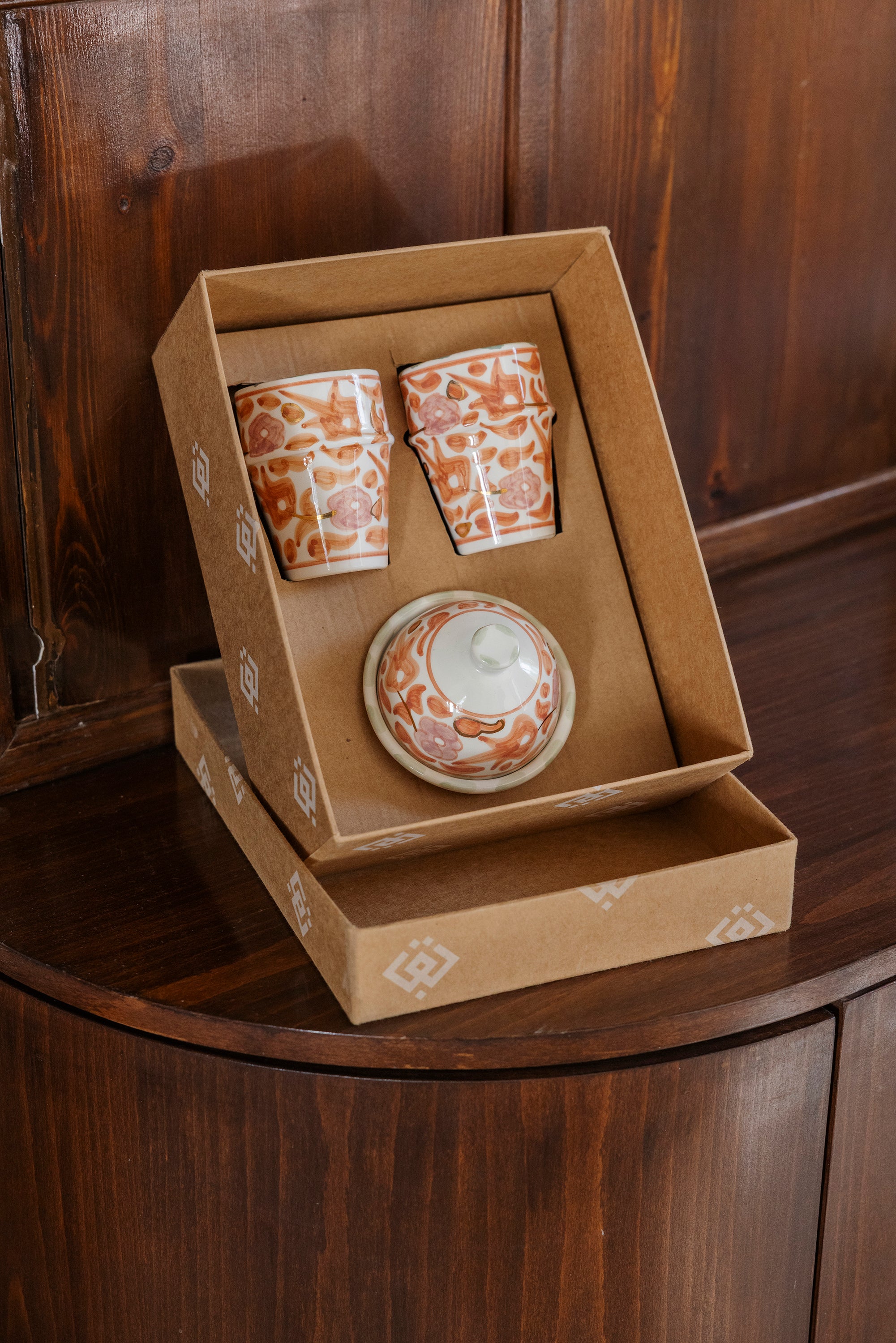 • Coffret composé de 2 moyennes tasses beldi roseraie et un beurrier roseraie gold
