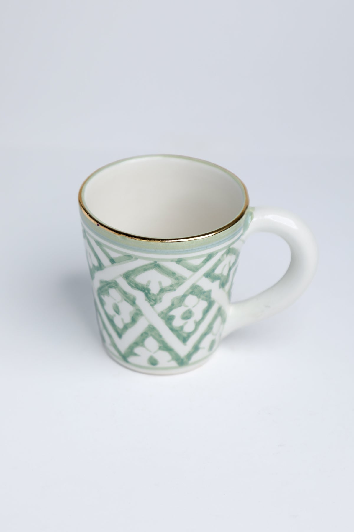 - Fabrication artisanale : Chaque tasse est méticuleusement réalisée à la main à travers une dizaine d'étapes, incluant le moulage, la peinture des motifs, l'émaillage et trois cuissons. La dernière cuisson révèle l'éclat de l'or véritable. Ce processus détaillé, qui peut durer jusqu'à 10 jours, reflète un savoir-faire artisanal exceptionnel tout en célébrant la tradition marocaine.