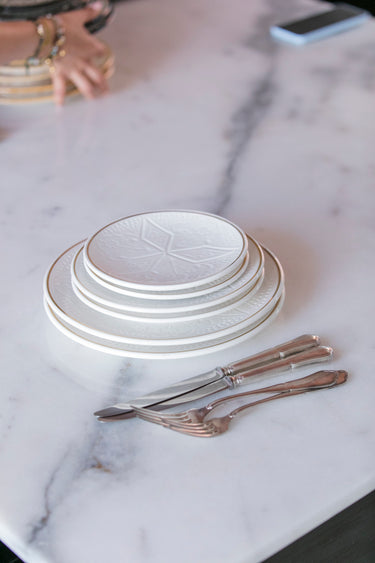 Découvrez nos Assiettes empreinte blanc gold, des pièces emblématiques et les plus prisées de notre marque. Véritables pièces maîtresses de votre table, elles offrent un terrain de jeu idéal pour jouer au Mix&Match Chabi-Chic. Leur polyvalence permet de les mixer à l’infini, que ce soit en total look ou de manière dépareillée, et l’effet est toujours saisissant.