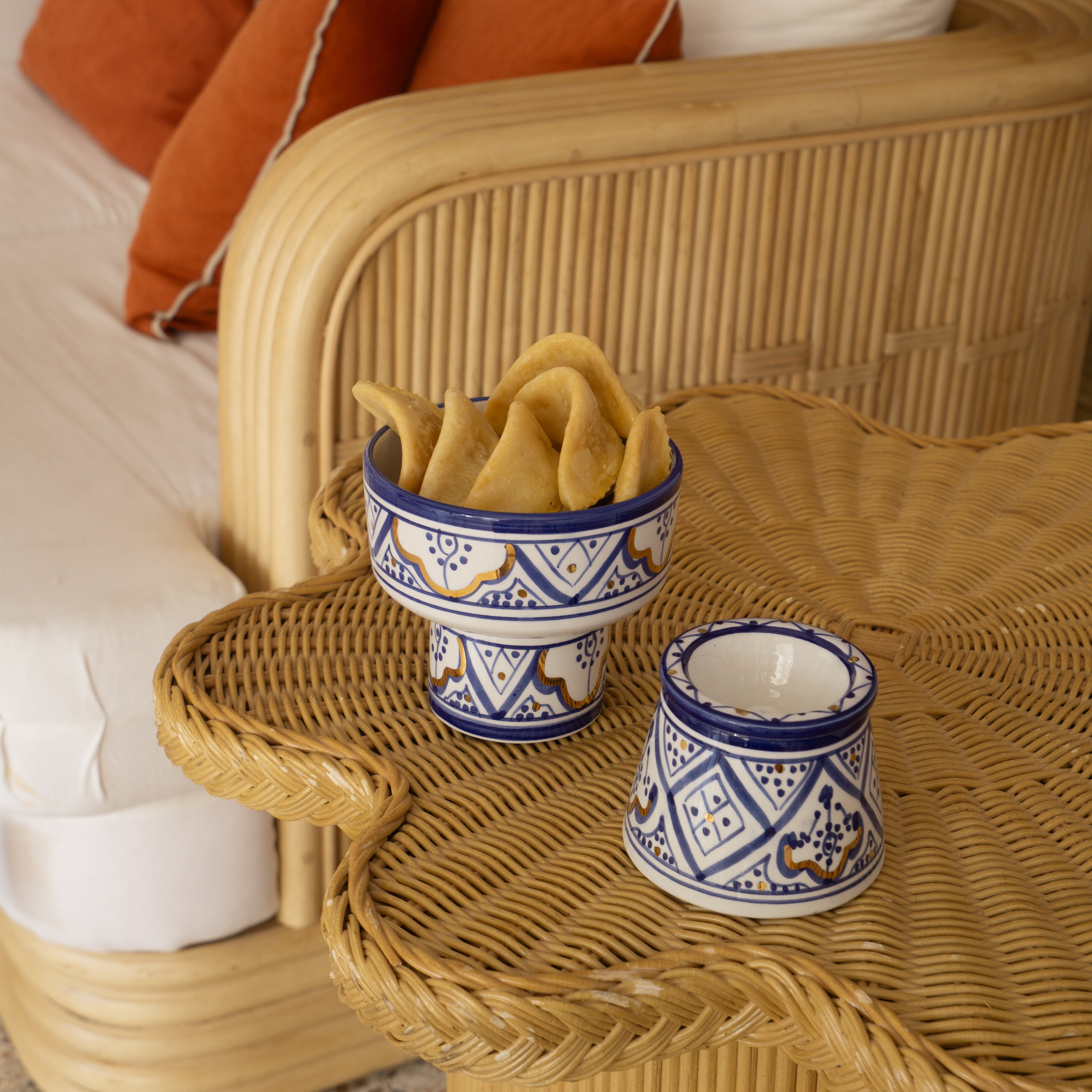 - Fabrication artisanale : Chaque pièce est soigneusement réalisée à la main à travers une dizaine d'étapes essentielles, incluant le moulage, le peinturage des motifs, l'émaillage et trois cuissons, dont la dernière révèle l'éclat de l'or véritable. Ce long processus peut prendre jusqu'à 10 jours. Ce dévouement au détail assure une qualité exceptionnelle tout en mettant en valeur le savoir-faire traditionnel marocain.
